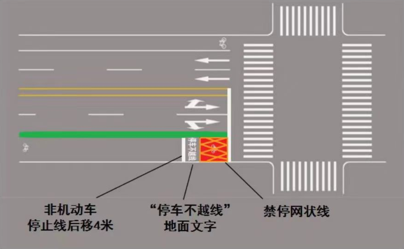 非机动车停车线后移3—5米,在停止线前施划网格线和“停车不越线”地面文字。这样可以有效减少路口机动车和非机动车的冲突,便于机动车右转通行,同时消除安全隐患,进一步保障行人和机动车的安全。
