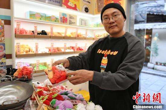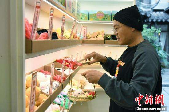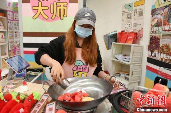 10月22日,长沙一玩偶店内的湘菜版jellycat受到顾客热捧。这些拥有表情的可爱玩偶,配上成人“过家家”的烹饪形式,受到了年轻顾客的喜爱。图为店员为顾客“切菜”。