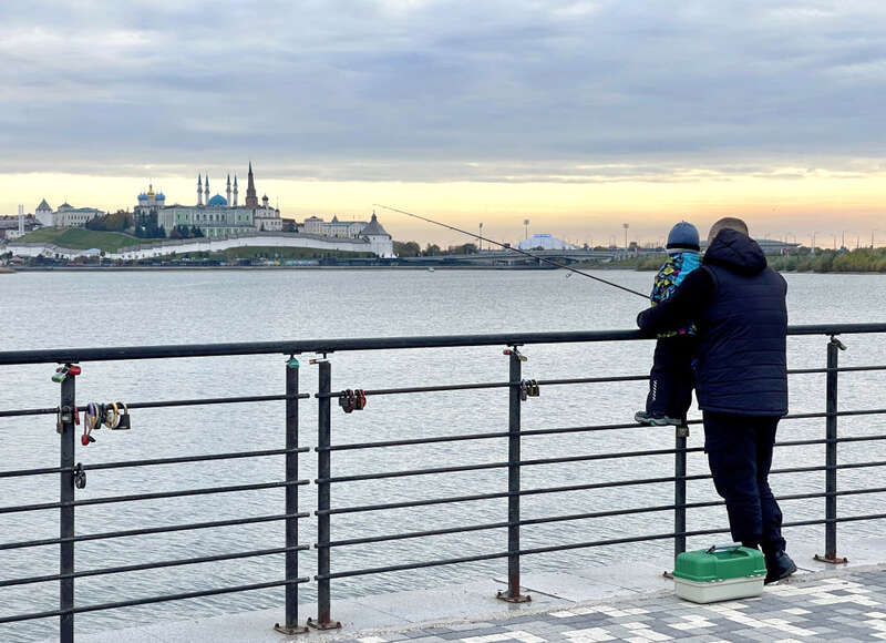 ↑10月20日,在俄罗斯喀山“家庭中心”外,一名男子抱着孩子在河畔钓鱼。新华社记者 翟健岚 摄