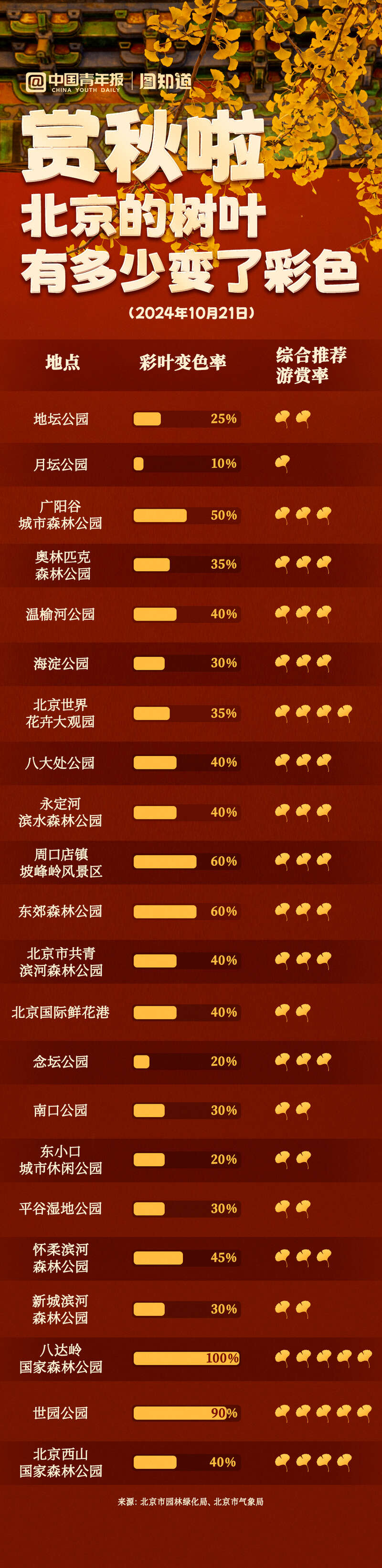 十月下旬,北京的彩叶景观已陆续进入最佳观赏期。北京播报多处公园和风景区的彩叶变色率,来看彩叶多少变了色,一起去邂逅色彩斑斓的城市。