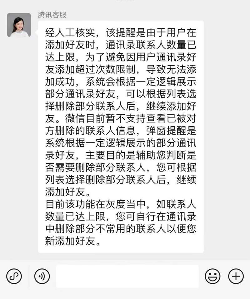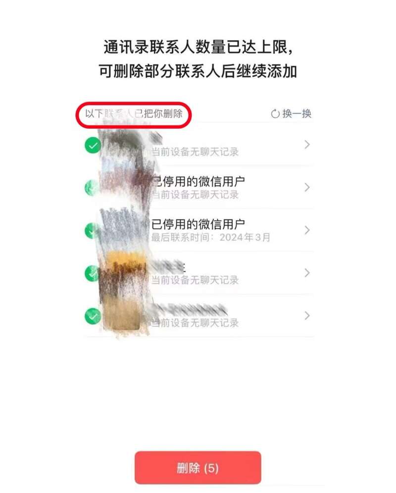 记者看到,多名网友晒出的截图显示,微信提示“通讯录联系人数量已达上限,可删除部分联系人后继续添加”,并给出几个联系人选项,用户可直接删除或选择“换一换”。