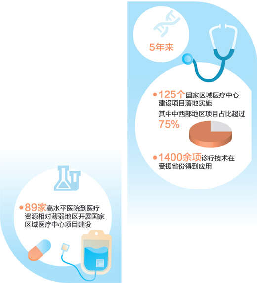 2019年,国家发展改革委等部门印发《区域医疗中心建设试点工作方案》。5年来,我国已有125个国家区域医疗中心建设项目落地实施,1400余项诊疗技术在受援省份得到应用,跨省、跨区域就医明显减少,为实现“看大病在本省解决”目标奠定了坚实基础。