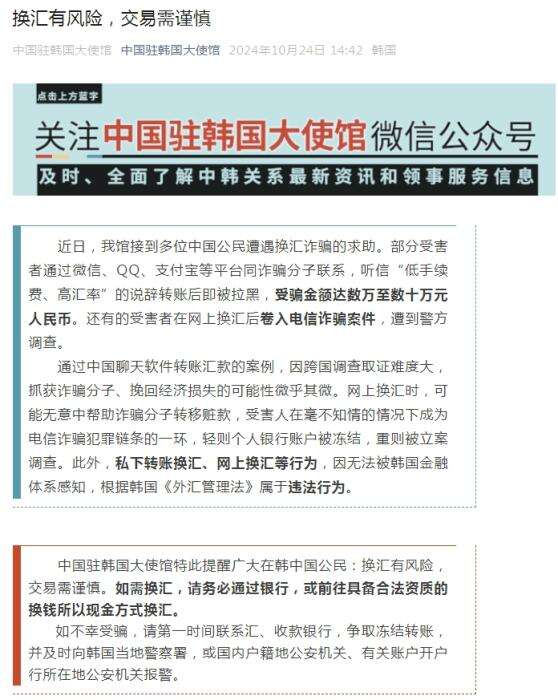 中国驻韩国大使馆特此提醒广大在韩中国公民:换汇有风险,交易需谨慎。如需换汇,请务必通过银行,或前往具备合法资质的换钱所以现金方式换汇。如不幸受骗,请第一时间联系汇、收款银行,争取冻结转账,并及时向韩国当地警察署,或国内户籍地公安机关、有关账户开户行所在地公安机关报警。