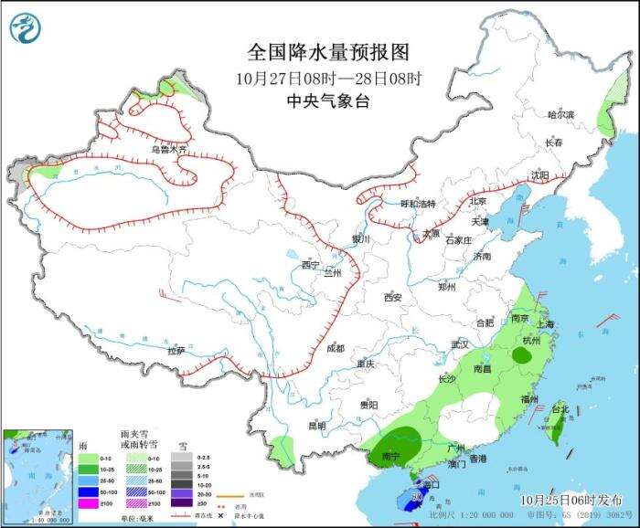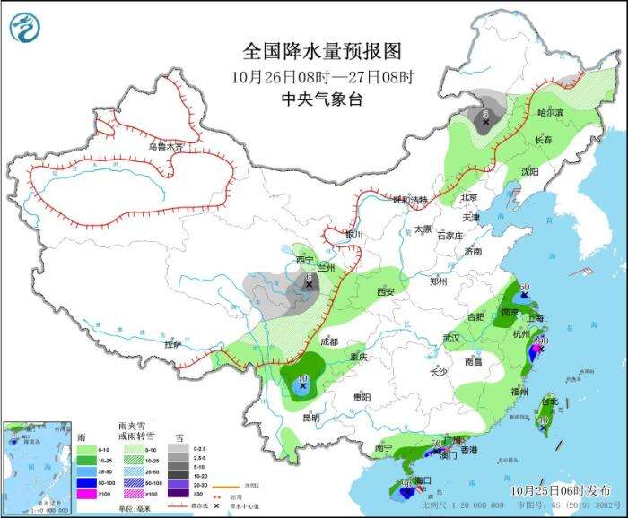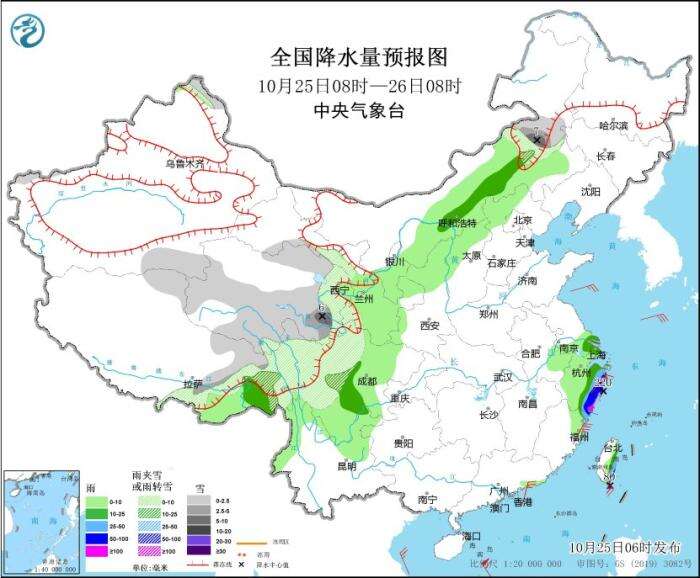 10月25日08时至26日08时,新疆阿勒泰山区和南疆南部山区、内蒙古中部、西藏东北部、青海东部和南部、甘肃祁连山山区、川西高原北部等地部分地区有小到中雪或雨夹雪,其中,内蒙古中部、青海东南部等地局部地区有大雪(5~7毫米)。内蒙古中部、西藏东南部、四川西南部、江苏东南部、上海、浙江东部、福建东北部、台湾岛东部、西沙群岛、中沙群岛等地部分地区有中到大雨,其中,浙江沿海地区、福建东北部、台湾岛东部、西沙群岛、中沙群岛等地部分地区有暴雨或大暴雨,局地特大暴雨(250~260毫米)。浙江东部、福建东部、台湾岛等地部分地区有4~6级风。