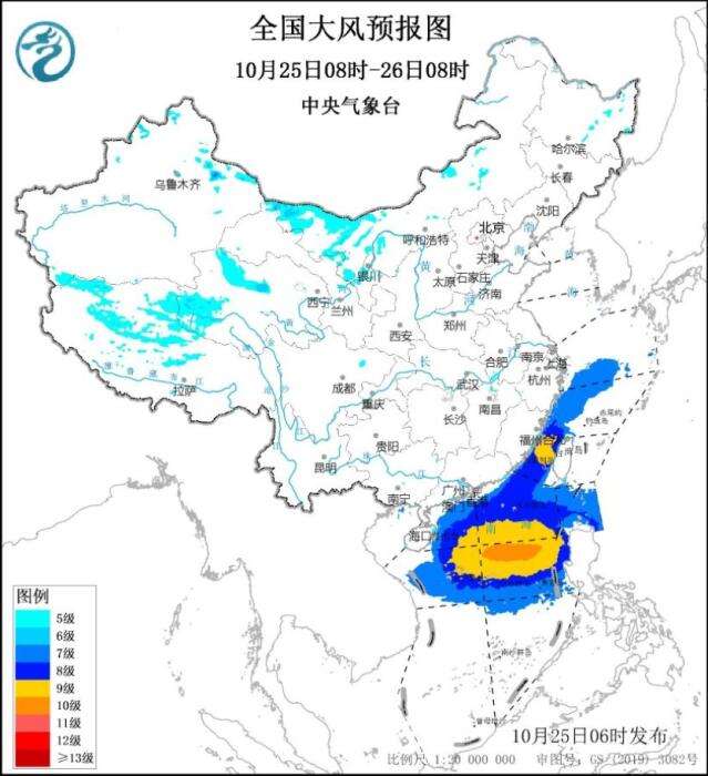预计,10月25日08时至26日08时,东海西部海域、台湾海峡、南海北部和中部海域、巴士海峡、东沙群岛、中沙群岛、西沙群岛将有7~9级、阵风10~11级的大风,其中南海中东部的部分海域风力可达10级、阵风11~12级。中央气象台10月25日06时继续发布大风黄色预警。