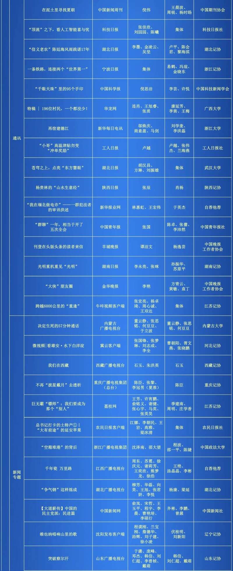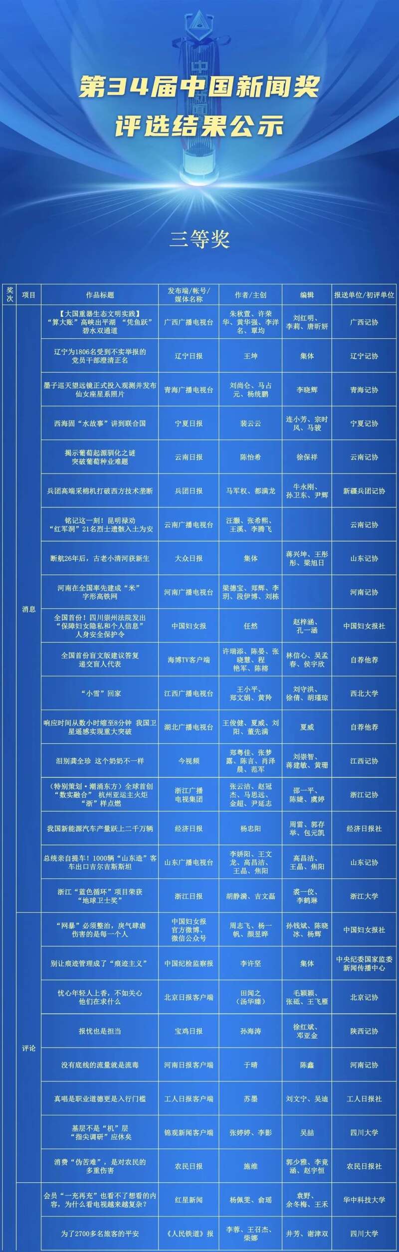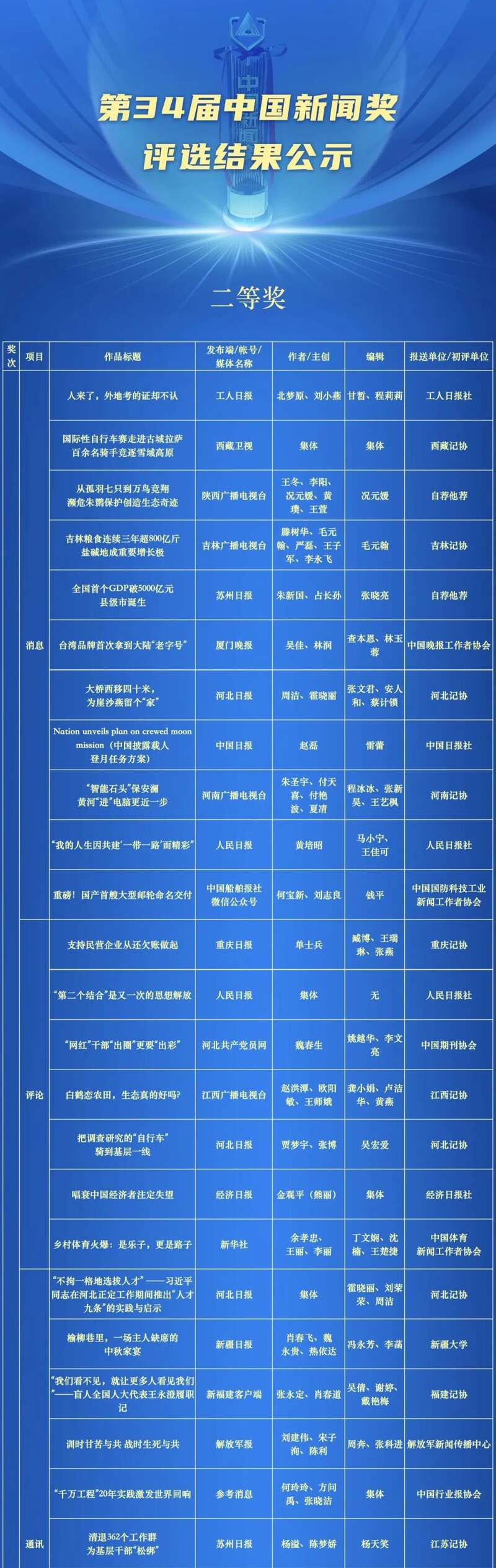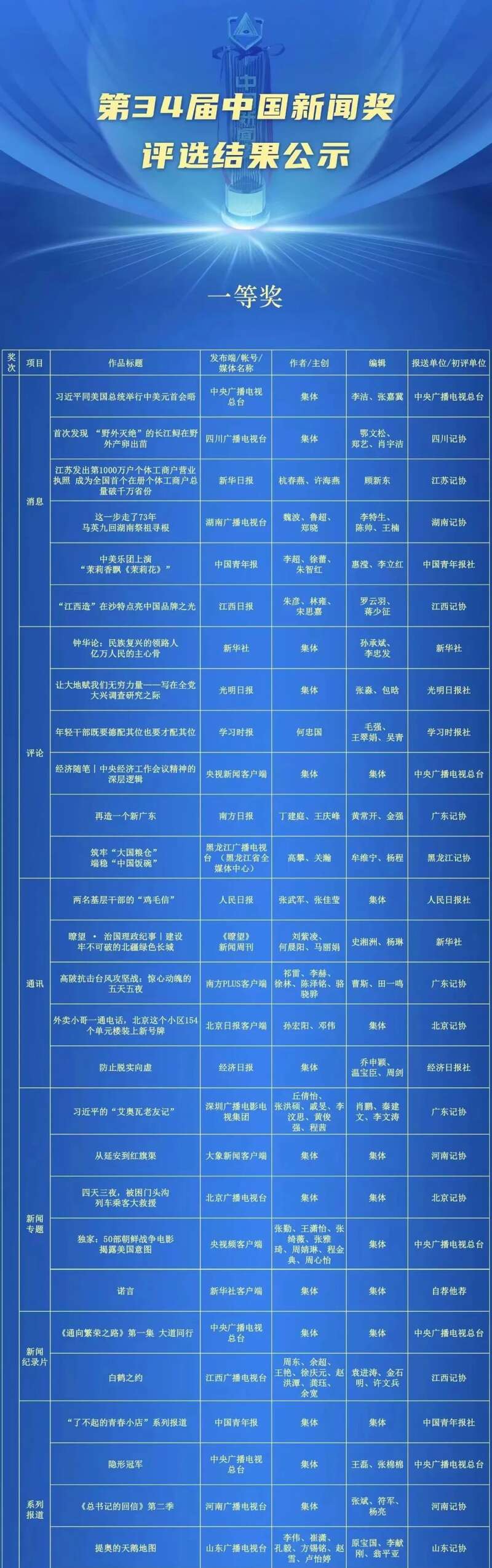 自10月29日起,中国记协在中国记协微信公众号、中国记协网公示第34届中国新闻奖、第18届长江韬奋奖评选结果。本届中国新闻奖共评选出378件拟获奖作品,其中特别奖4件、一等奖75件、二等奖111件、三等奖188件;本届长江韬奋奖共评选出20位拟获奖人员,其中长江系列10位,韬奋系列10位。同时公示的还有本届中国新闻奖、长江韬奋奖评选细则和评委、审核委员名单。