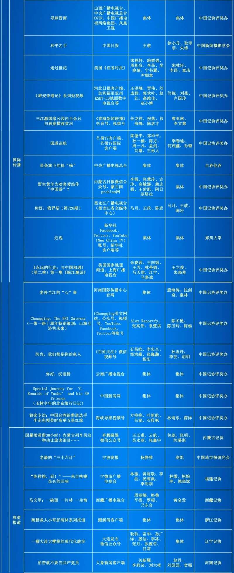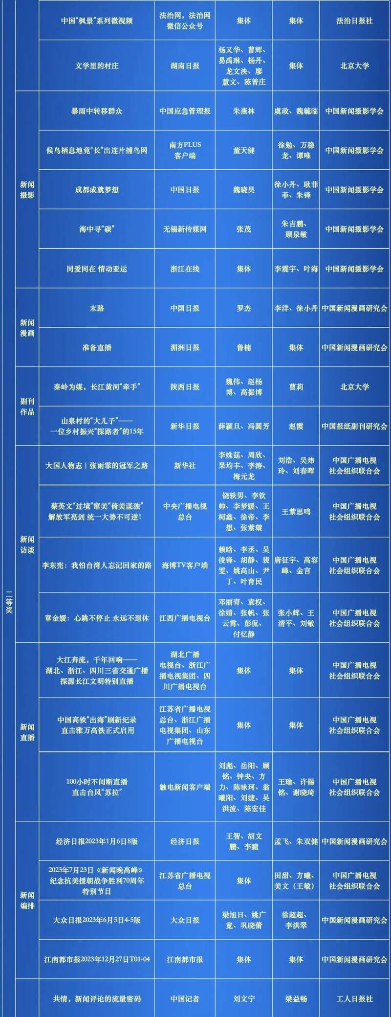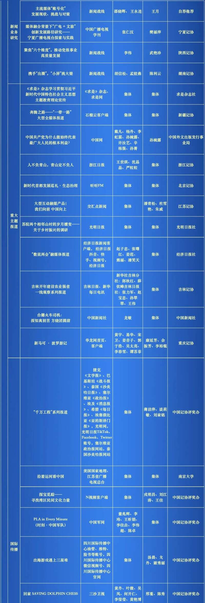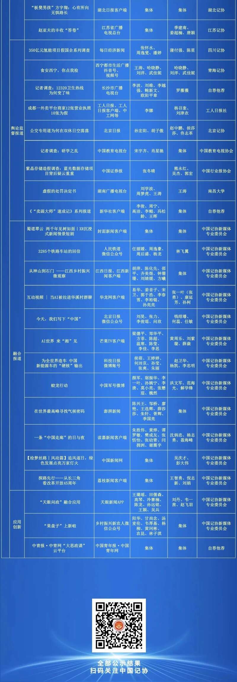 自10月29日起,中国记协在中国记协微信公众号、中国记协网公示第34届中国新闻奖、第18届长江韬奋奖评选结果。本届中国新闻奖共评选出378件拟获奖作品,其中特别奖4件、一等奖75件、二等奖111件、三等奖188件;本届长江韬奋奖共评选出20位拟获奖人员,其中长江系列10位,韬奋系列10位。同时公示的还有本届中国新闻奖、长江韬奋奖评选细则和评委、审核委员名单。