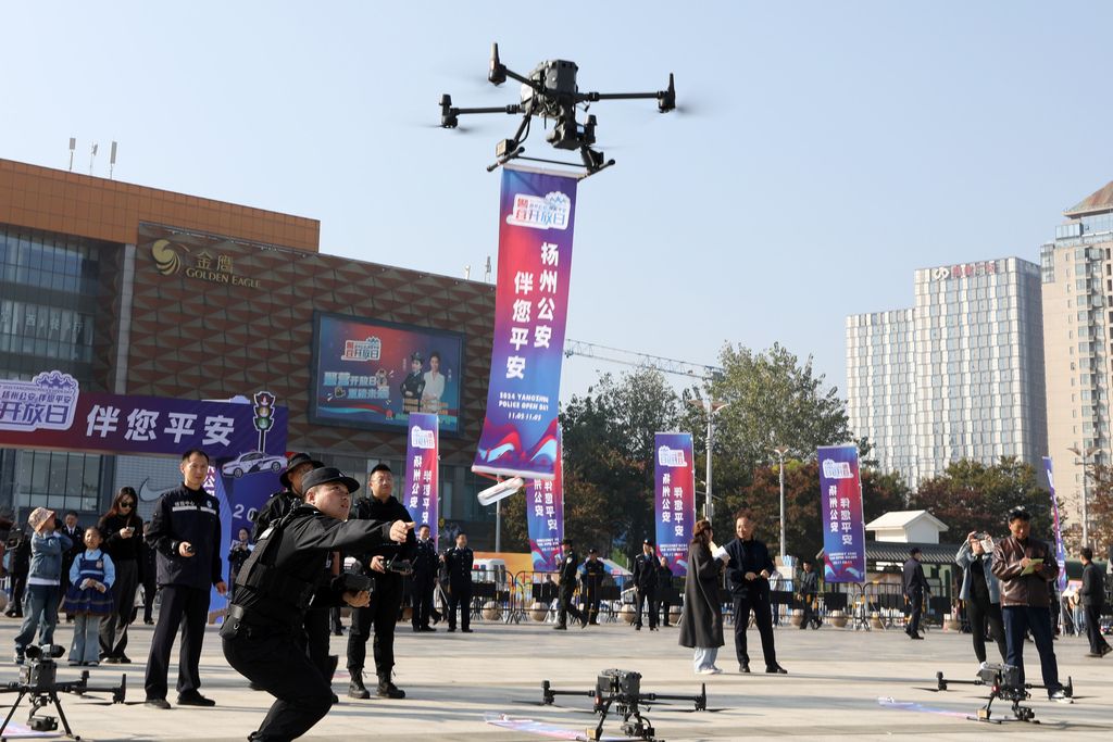 2024年11月2日,江苏扬州,警营开放日活动,市民正在现场观看警用无人机技能展示。