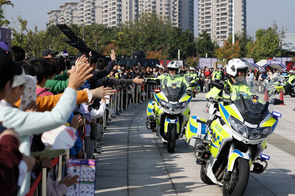 2024年11月2日,江苏扬州,警营开放日活动,市民正在现场观看交警警摩技能展示。