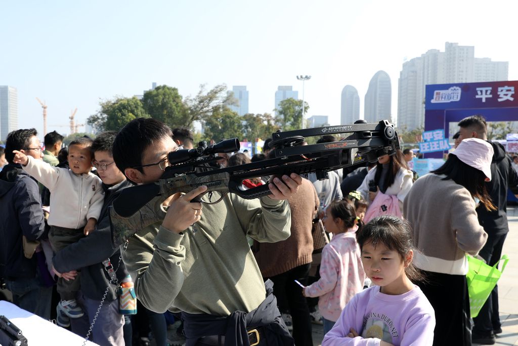 2024年11月2日,江苏扬州,警营开放日活动,市民在体验警务装备。