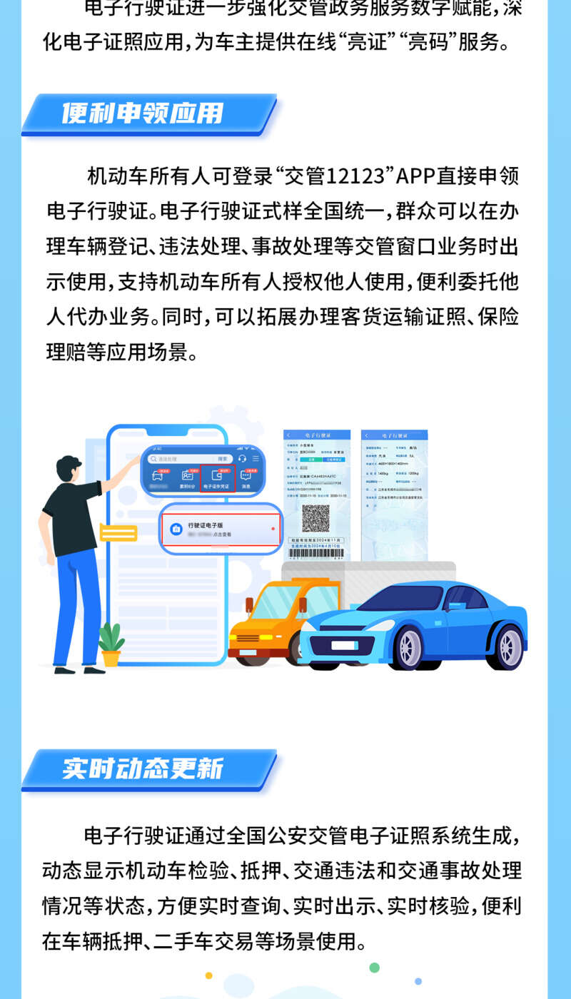 一是便利申领应用。机动车所有人可登录“交管12123”APP直接申领电子行驶证。电子行驶证式样全国统一,群众可以在办理车辆登记、违法处理、事故处理等交管窗口业务时出示使用,支持机动车所有人授权他人使用,便利委托他人代办业务。同时,可以拓展办理客货运输证照、保险理赔等应用场景。二是实时动态更新。电子行驶证通过全国公安交管电子证照系统生成,动态显示机动车检验、抵押、交通违法和交通事故处理情况等状态,方便实时查询、实时出示、实时核验,便利在车辆抵押、