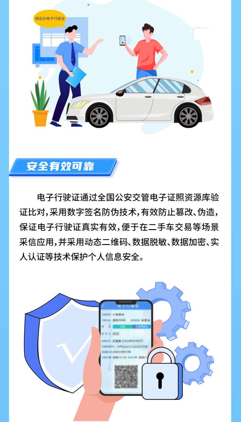 三是安全有效可靠。电子行驶证通过全国公安交管电子证照资源库验证比对,采用数字签名防伪技术,有效防止篡改、伪造,保证电子行驶证真实有效,便于在二手车交易等场景采信应用,并采用动态二维码、数据脱敏、数据加密、实人认证等技术保护个人信息安全。需要说明的是,按照《道路交通安全法》规定,纸质行驶证应当随车携带;电子行驶证主要应用于相关窗口业务办理。