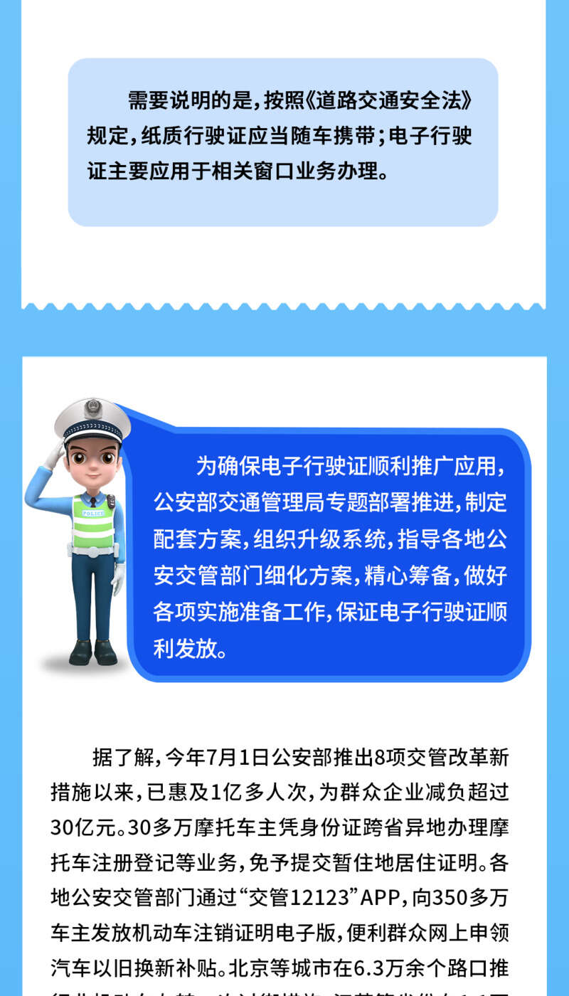 今年7月1日,公安部推出实施公安交管8项便民利企改革新措施,其中在北京、天津、苏州等60个城市试点推行机动车行驶证电子化,目前已累计为5000多万名车主核发电子行驶证,取得良好效果。