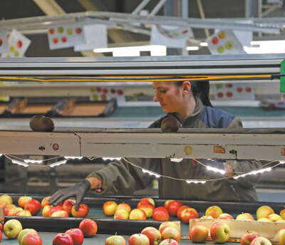 波兰格鲁耶茨县一家苹果加工企业内,当地工人正在分拣苹果。