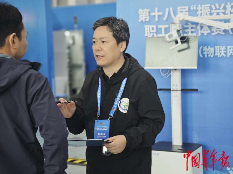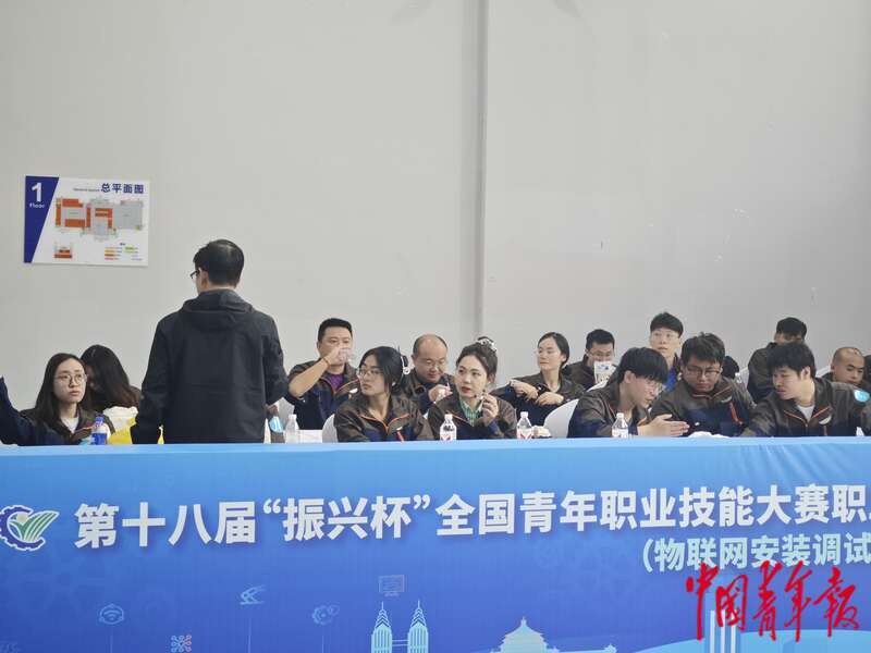 11月5日,重庆电子科技职业大学,第十八届“振兴杯”全国青年职业技能大赛现场,裁判员在沟通。中青报·中青网记者 耿学清/摄