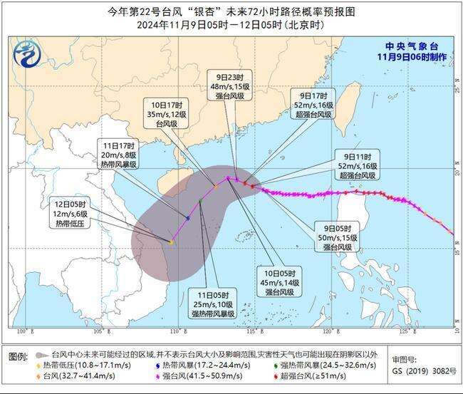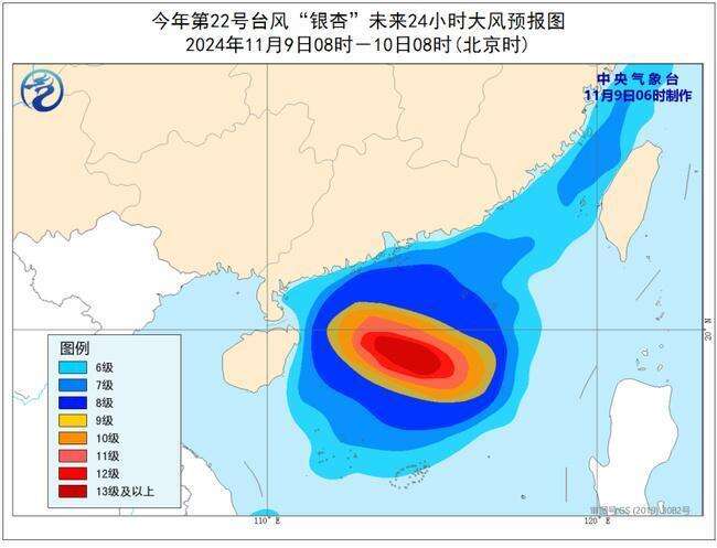 大风预报:9日08时至10日08时,受冷空气和台风“银杏”的共同影响,台湾海峡、南海北部和中部及西沙和中沙群岛、福建沿海、广东沿海将有6~8级、阵风9~10级的大风,其中南海北部和中部的部分海域风力可达9~11级、阵风12~13级,“银杏”中心经过的附近海域风力可达12~16级,阵风17级及以上。