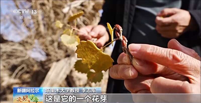 塔里木大学教授 李志军:这是它的一个花芽,说明它明年可以开花结果,它就可以繁殖后代,这也是输水拯救胡杨的终极目标,就是一定让它恢复到它能够自我繁衍。