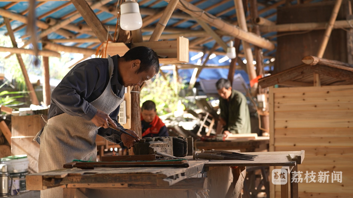 曹日林是篁岭村有名的木匠师傅,村里进行景区开发后,他和另外五名木匠一起负责起景区内古建筑的日常维护。眼下他正在对一栋古建筑的“冬瓜梁”进行雕刻修复,“篁岭的徽派建筑就是有三雕,木雕、砖雕、石雕,其中木雕上的很多图案都雕刻着耳熟能详的民俗故事。”曹日林一边转动刻刀,循着前人的痕迹雕琢修复木梁上被风霜侵蚀的图案,一边介绍着。在古宅修复重建的过程中,传统的建造技艺得以活化传承。
