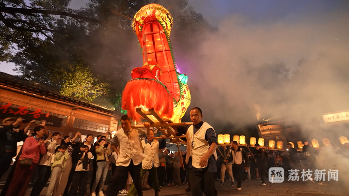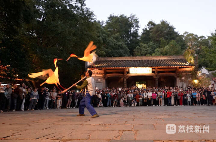 夜幕降临,篁岭村村口广场上聚集起大批游客,大家围成一个圈,将中间的空地空出来,翘首等待着一场非遗灯彩活动。伴随清脆的鹤鸣声,以竹骨为架、彩纸扎制的仙鹤立于扁担两头,随着灯彩师傅上下舞动,两只仙鹤翩翩起舞,引得游人阵阵喝彩。仙鹤舞罢,锣鼓声起,村民和游客一起舞起200多米长的板凳龙灯,带着对美好生活的祈愿穿梭在挂满花灯的街巷中。