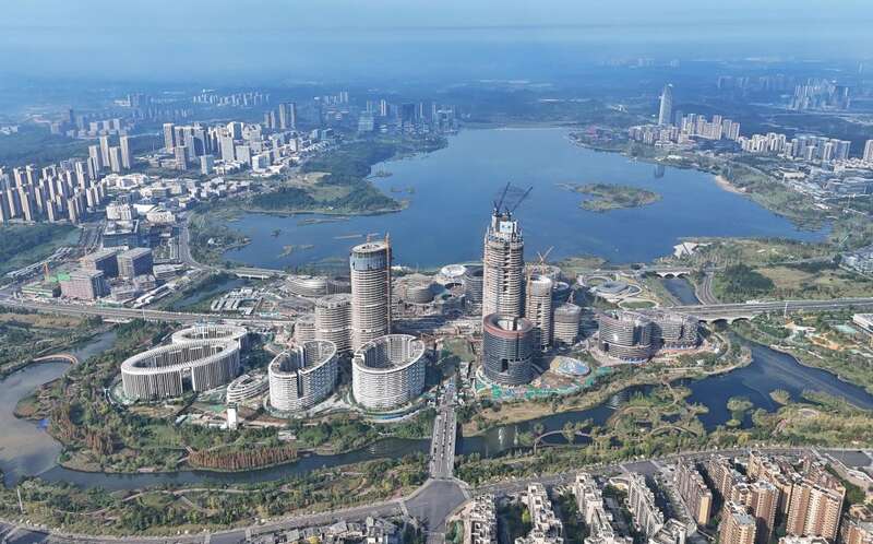 彩林斑斓、芙蓉花开,兴隆湖畔拥红叠翠。从空中俯瞰,占地1578平方公里的天府新区由成都、眉山两大片区组成,形似一匹骏马,从成都平原东南腹地昂首腾跃向前飞驰。150余个大小公园如明珠般璀璨跃动,540公里的绿道似绸带嵌入繁华都市,生态优先、绿色发展,天府新区着力打造公园城市“样板”。