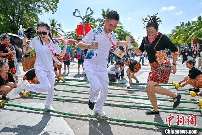 民族大联欢中,黎家舞、醒狮表演、服饰走秀……各种精彩节目轮番上演。运动员“花式”体验黎家打柴舞,现场欢乐气氛拉满。