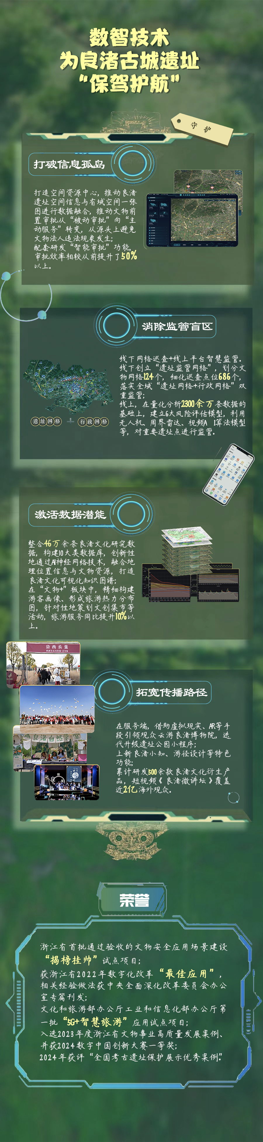 2024年是良渚古城遗址申遗成功五周年,五年来,良渚古城遗址在数智应用方面取得系列成果。其中,“良渚遗址5000+”数智应用,通过“空间规划管控+网格双重监管+平台监测预警”模式强化大遗址综合保护,初步实现“变化可监测、风险可预警、行为可追溯、保护可提前”的遗址保护闭环。