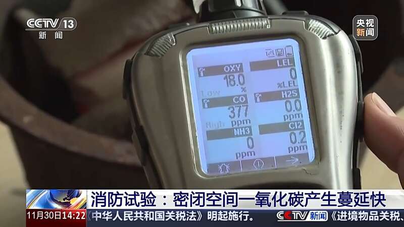 在一个大约10平方米的密闭房间内,消防员点了一盆炭火,随后关门离开。大约半小时后,消防员进入房间,检测仪器立即发出警报声,显示房间内一氧化碳的浓度已经骤升至370多ppm,远远超过安全标准。