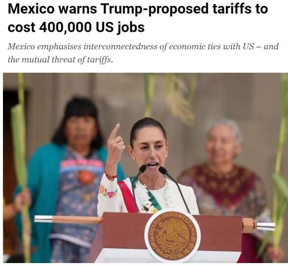 针对特朗普日前称,就职后将对从加拿大和墨西哥两国进口到美国的所有产品征收25%的关税。墨西哥和加拿大27日均表示,如果美国真的在明年加征关税,将会“以牙还牙”。