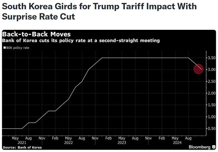 韩国中央银行——韩国银行28日召开金融货币委员会会议,决定下调基准利率25个基点至3%。