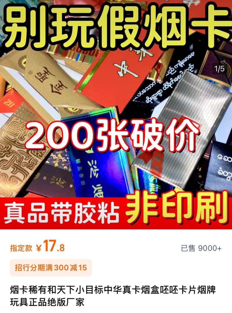 澎湃新闻注意到,不少网店专卖“烟卡”,有的销售量达数万单。这些网店往往强调“真烟卡”“有胶痕”“非印刷”“稀缺”等。不过,澎湃新闻随机购买三单,到货后发现其中两家卖的疑似印刷品,没有胶痕。对此,其中一家店铺否认是自己印刷的,“是从烟厂全新回收切割的”,不是假的,“假的上面不会有防伪标志,也不会有水转印”,“我们自己印不出来这种,况且自己印还违法”。该店铺人员还称,“你想要带胶的,我们也有。”