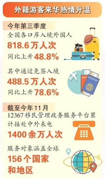 据国家移民管理局统计,今年第三季度,外国人入境818.6万人次,同比上升48.8%;其中,通过免签入境488.5万人次,同比上升78.6%。各口岸入境人数均迎来可观增长。截至11月24日,北京大兴机场边检站受理签发144小时临时入境许可量为去年同期的5倍;截至11月27日,昆明出入境边防检查站今年在昆明机场口岸共为37万余名外国旅客办理入境通关手续,其中免签入境的外国旅客达24万余人,同比增长1158%。