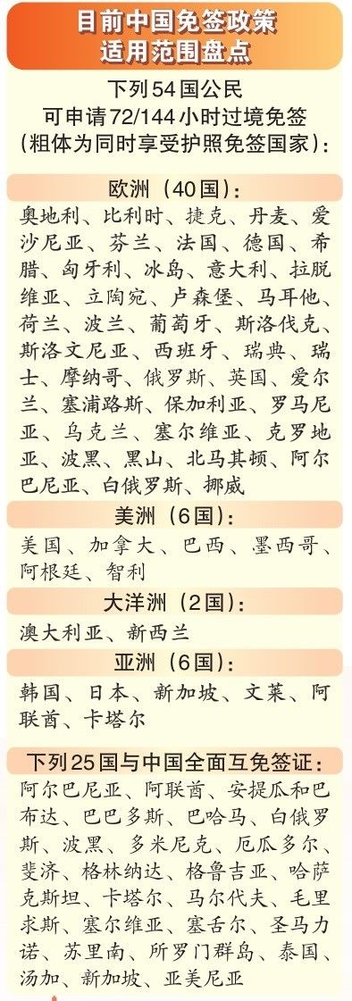 自2023年年末起,中国扩大144小时过境免签政策的适用范围,并先后对38个国家实行免签,目前累计同25个国家实现全面互免,同157个国家和地区缔结了涵盖不同护照种类的互免签证协定。