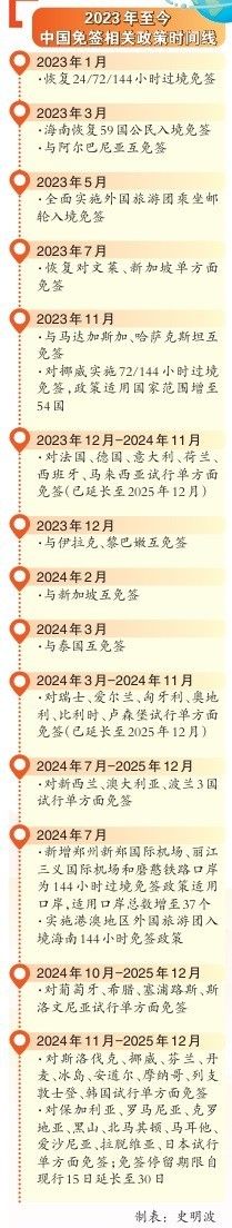 编者的话:自去年年底至今,中方先后对38个国家实行免签,目前累计同25个国家实现全面互免签证。同时,通过优化签证申请表、取消签证预约、扩大免采指纹范围、调减签证规费等措施,来华签证手续也变得更加高效便捷。随着免签政策的红利持续释放,来华旅游已成为外国游客的“流量密码”,也是彰显中国扩大高水平开放决心的“政策名片”。接受《环球时报》记者采访的业内人士普遍观察到,过去一年来,免签政策给中国入境游和中外民间交流带来了从量到质的全方位提升。有业内人士预测,2025年,中国免签政策的效果会得到更加可观的显现。