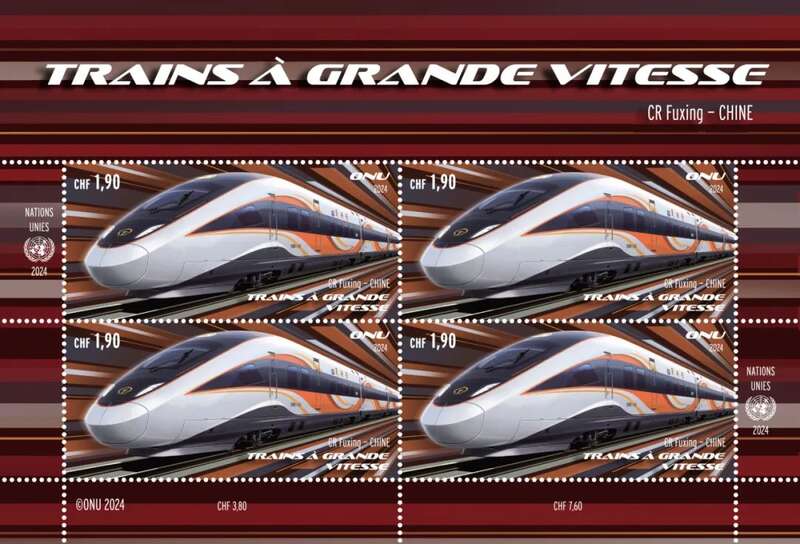 为庆祝“世界可持续交通运输日”,联合国邮政管理局于11月26日发行了高铁主题邮票一套六枚,并在2024中国亚洲集邮展览期间举行了邮票揭幕仪式。这是联合国邮政首次展示高铁主题邮票,也是中国复兴号首次登上联合国邮票。