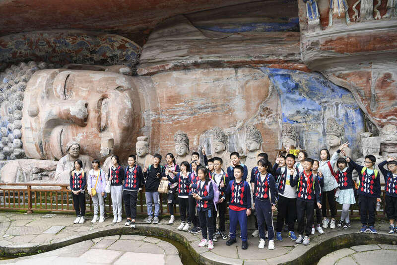 参加研学活动的学生在大足石刻景区留影。记者 王全超 摄