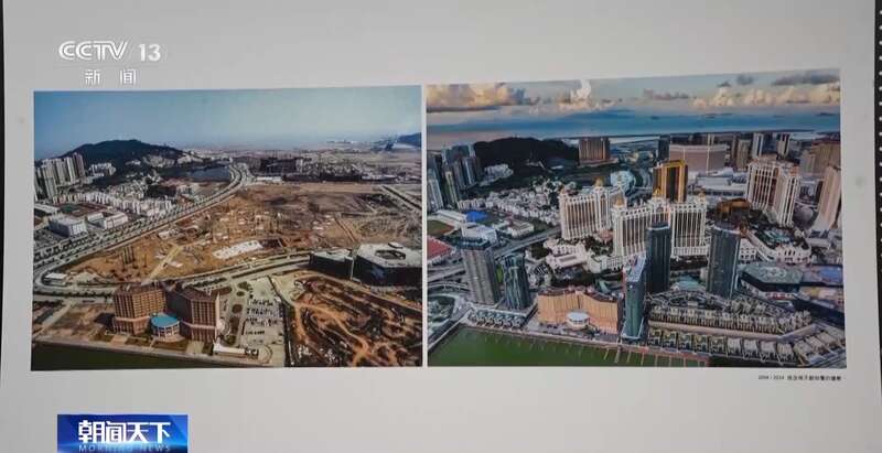 澳门摄影家 陈显耀:回归之后,随着我们澳门的发展,也是带动周边区域一起发展繁荣。我们画面看到的是横琴,上面的照片是2012年的时候,横琴都是山体,在准备开发了。下面是成立的横琴粤澳深度合作区,整个横琴的建设也为我们澳门的发展建设提供了一个很重要的支撑、保障。