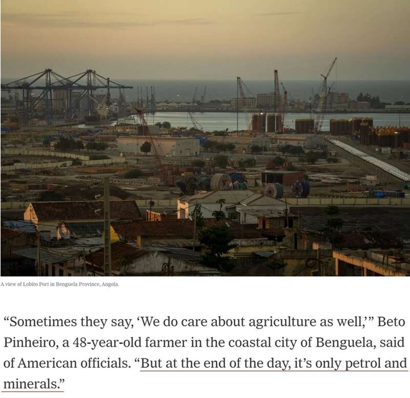 家住安哥拉沿海城市本格拉的48岁农民贝托·皮涅罗说:“有时他们(美国官员)会说,‘我们也关心(安哥拉的)农业’……但归根结底,(美国关心的)只有石油和矿产。”