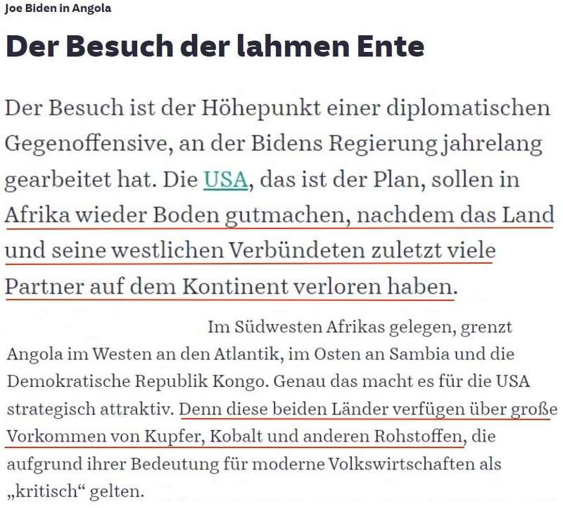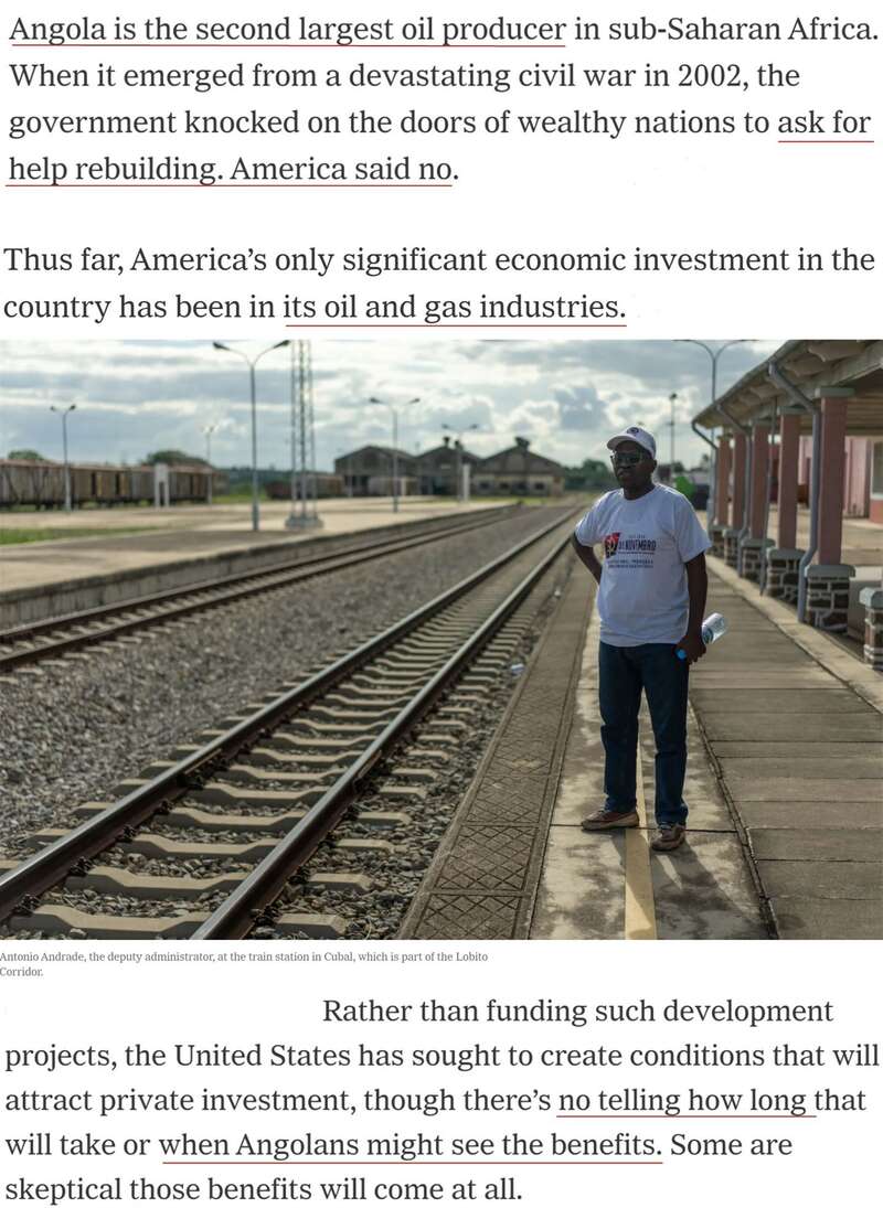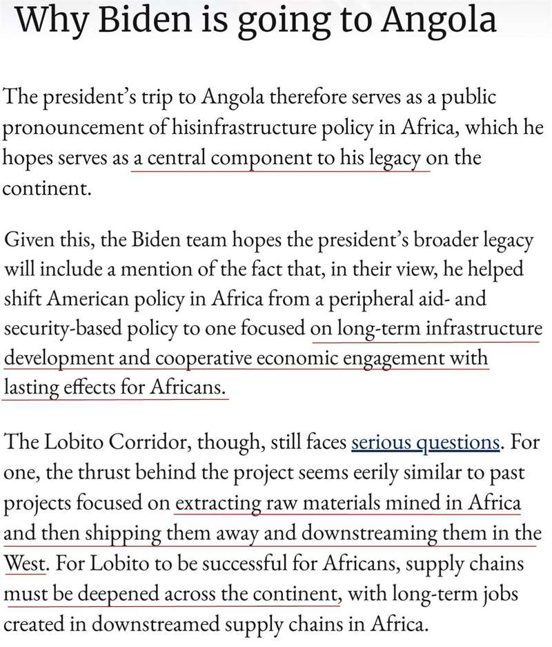 《纽约时报》日前刊文称,拜登此访重点推广的“洛比托走廊”项目,将鼓励私人投资参与项目,因为美国只提供部分资金。没人知道建成这条“走廊”需要多长时间,也不知道安哥拉人什么时候能看到好处。一些人对这些好处能否实现持怀疑态度。