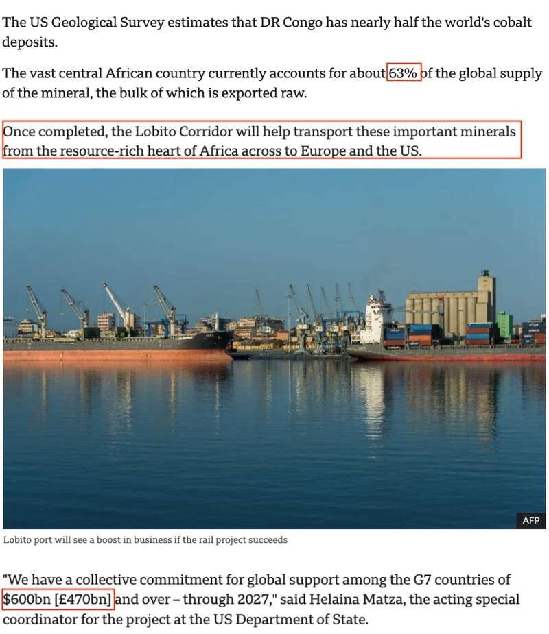 “洛比托走廊”是刚果(金)、赞比亚和安哥拉这三个非洲国家以及美国、其他七国集团(G7)成员国和私人投资者之间的一个联合项目。这条全长1344公里的铁路线将刚果(金)的钴、锂和铜矿以及赞比亚的铜带地区连接到安哥拉的大西洋港口城市洛比托。