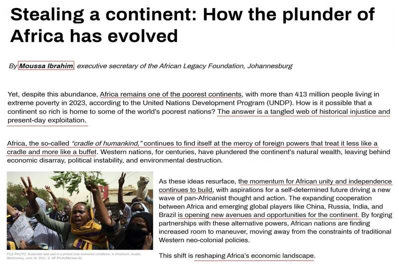 非洲遗产基金会执行秘书穆萨·易卜拉欣发文指出,尽管非洲自然资源丰富,但仍是最贫穷的大陆。时至今日,非洲这个人类摇篮仍受到外国列强的摆布,西方对非洲自然资源的劫掠只不过换了包装。