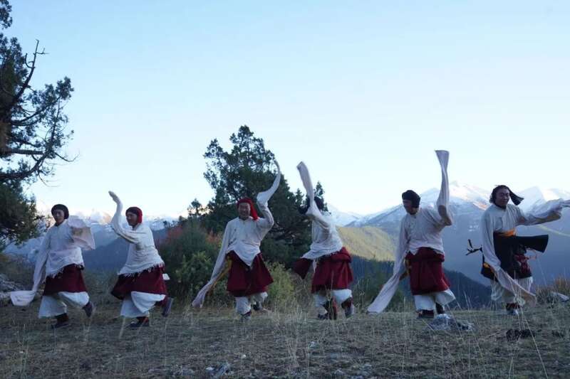 原始森林里,突然出现的一片草坪是舞蹈队平时练习嘎木卓舞的天然场地,阿龙和他的伙伴们互相帮忙装扮上,准备就绪后,他们开始了练习,他们互相分成两组,两组互相对唱歌词,当歌词告一段落后甩手沿圈走动,挥舞双袖载歌载舞,奔跑跳跃变化动作越来越快,动作挺拔,舞姿轻盈,无不表达着嘎木群众对美好生活期盼和积极向上的生活态度。无不体现着民族文化的自豪感。