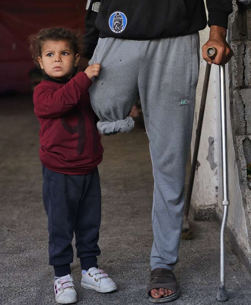 12月3日,加沙地带汗尤尼斯,在以色列军事袭击中失去了右腿的巴勒斯坦人穆罕默德·法耶德(右)和家人一起在学校大楼内。联合国于1992年将每年的12月3日定为“国际残疾人日”,以提高人们对残疾人权利、面临的挑战和解决方案的认识。视觉中国供图