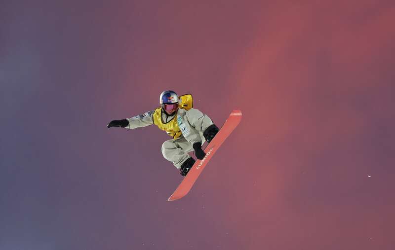 12月1日,北京首钢大跳台,运动员伴随着晚霞正在进行训练。11月29日-12月1日,2024-2025赛季国际雪联单板及自由式滑雪大跳台世界杯在北京首钢园举行。视觉中国供图
