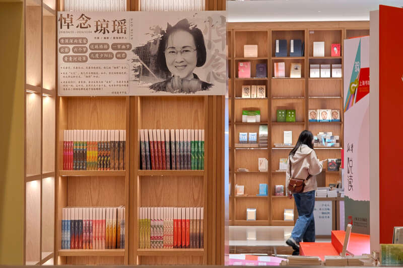 12月5日,上海,上海书城在二层开设了琼瑶书籍专区,陈列着琼瑶的经典作品《还珠格格》《一帘幽梦》等,书架上方有琼瑶的肖像和悼念文字。12月4日13时22分,知名作家琼瑶在新北市家中去世,终年86岁。视觉中国供图