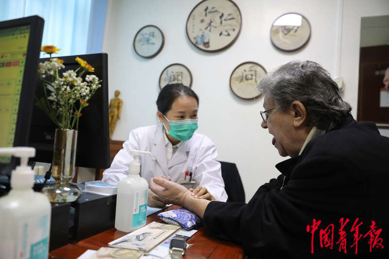2024年12月4日,北京市朝阳区三里屯社区卫生服务中心,中医馆的徐静大夫正在给来自比利时的老人莫劳号脉和看舌苔。莫劳今年70来岁,来中国30多年了。他患有腰腿疼和其他一些常见病,在当地这家社区医院看诊随访、健康管理有6年多的时间。 据了解,三里屯是北京的使馆区,除了诸多外国驻华使馆外,一批涉外宾馆、外交人员公寓、外国驻华商社等均分布于此,外籍人士比较集中,日常健康保健和就医需求较为明显。位于当地的三里屯社区卫生服务中心,专门设立涉外诊室,并加强医务人员的外语培训,方便更好地对外籍患者进行诊疗服务。中青报·中青网记者 陈剑/摄