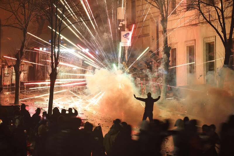 12月1日,格鲁吉亚第比利斯,针对政府延迟加入欧盟谈判的决定,部分抗议者在国会前进行示威活动。视觉中国供图