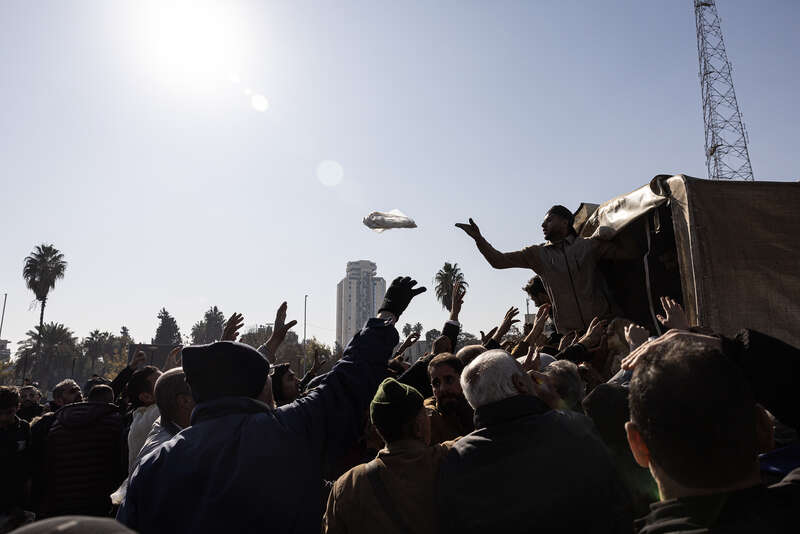 12月3日,叙利亚塔尔里法特,返回阿勒颇的居民等待领取面包,民众在战火中努力恢复正常生活。视觉中国供图