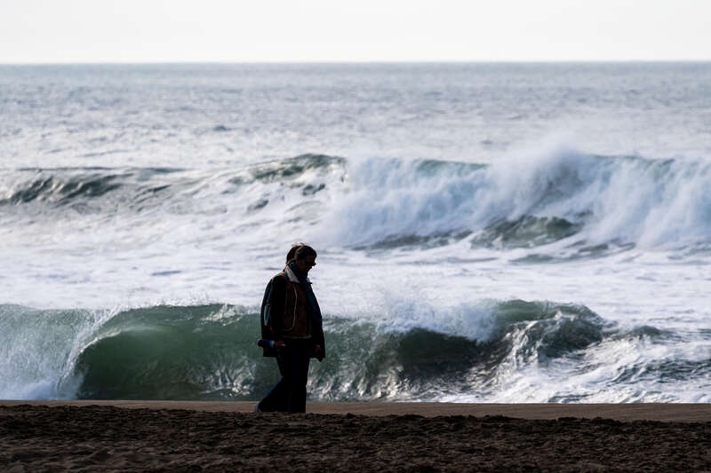 12月5日,美国加利福尼亚州旧金山,海啸警报过后,行人走在海滩上。美国加州北部海域发生里氏7.0级地震,西海岸区域发布海啸警报。视觉中国供图