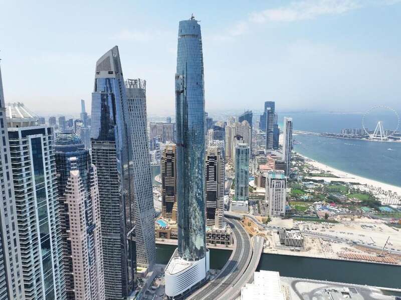 得益于高度团结协作的国际化管理团队,项目高效推进:2020年8月,项目攻克8000立方米7米厚混凝土筏板一次性浇筑大关,项目地基结构施工完成;2021年11月,项目团队实现了“三天一层”标准层施工,创造了当时迪拜房建市场标准层施工的最快纪录;2023年1月,所有竖向结构全部浇筑完成,项目高度达到373.5米。
