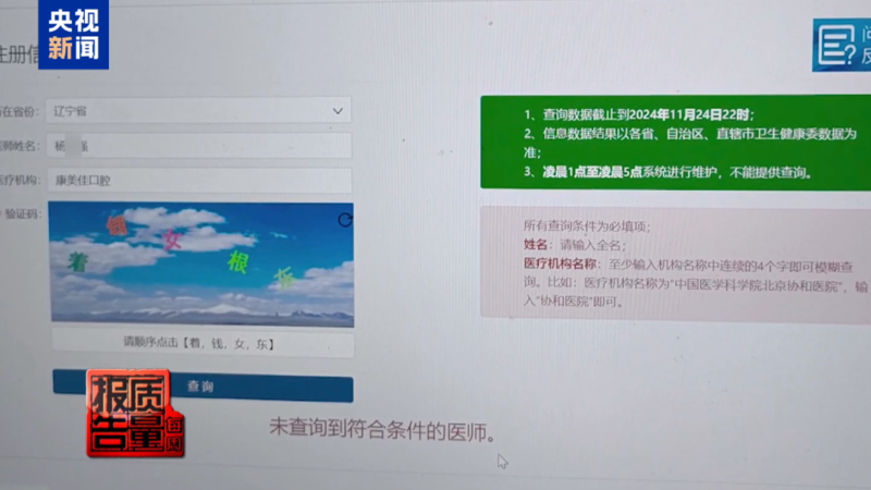 随后,记者通过国家卫健委官方平台提供的医师执业资格信息开放查询页面,对走访过的口腔诊所医生的执业资格信息进行了查询,发现建议王女士把坏牙以及相邻的好牙一并治疗的院长,根本无法检索出执业注册信息。